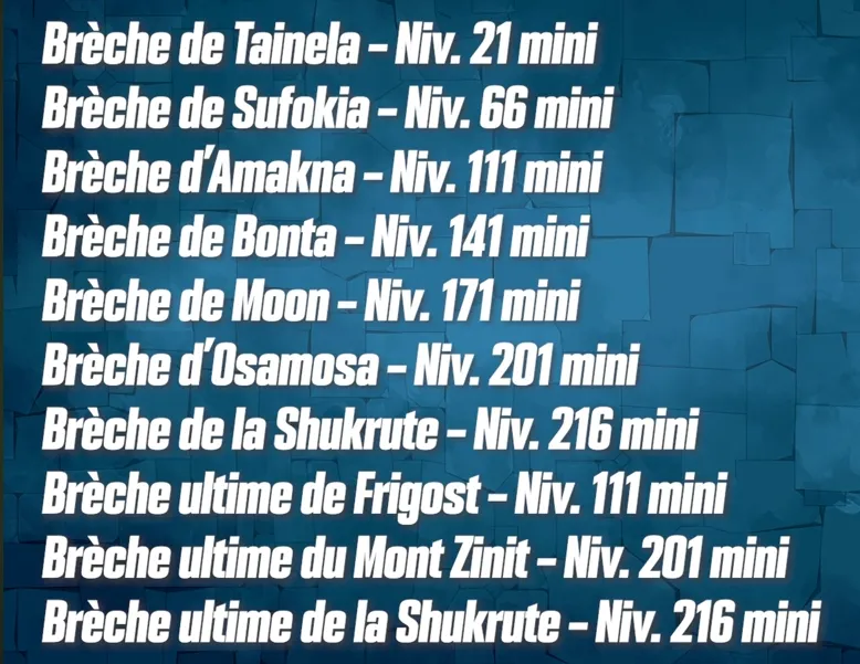| Lvl donjon : 155 | 10 | 20 | 30 | 40 | 50 | 60 | 70 | 80 | 89 | 99 |